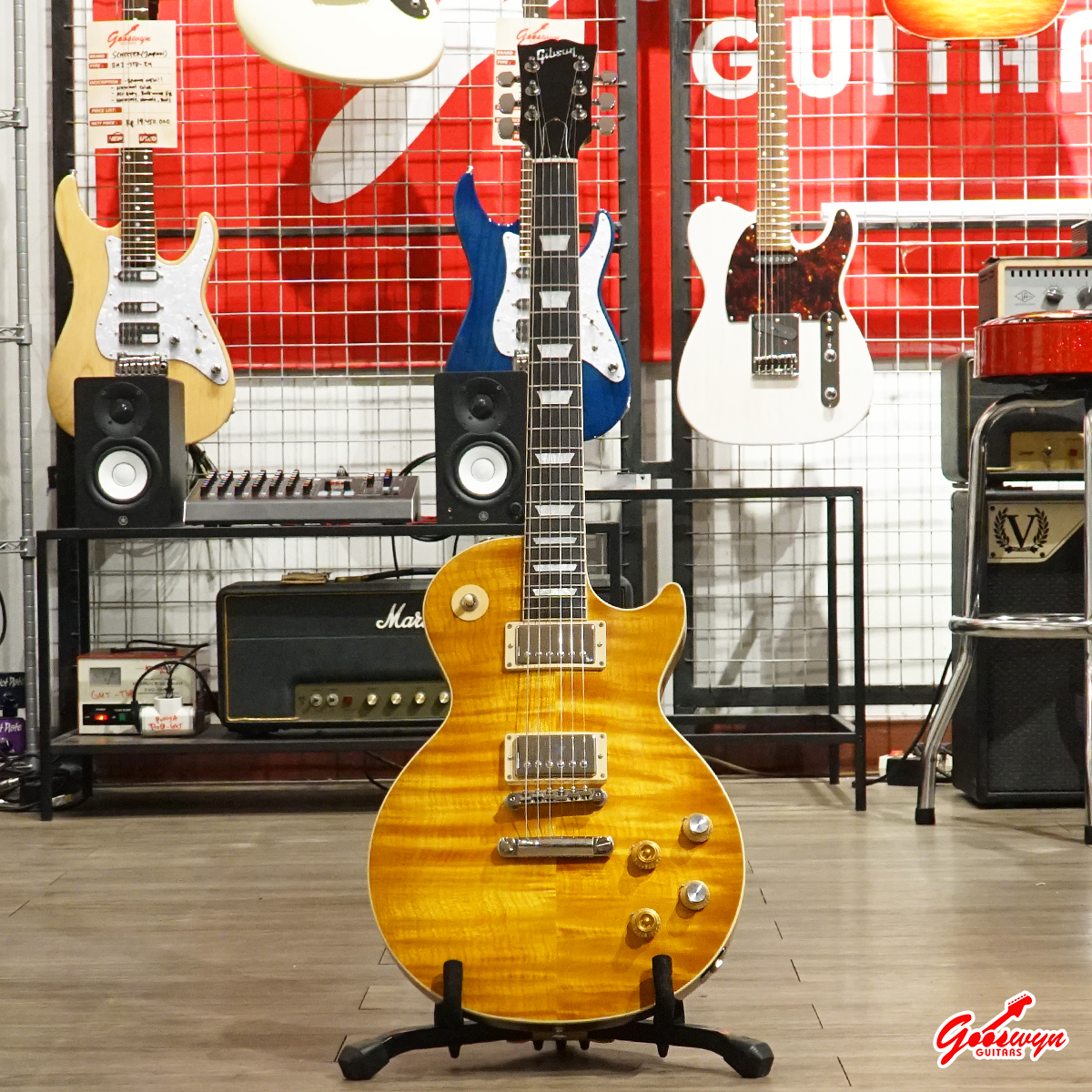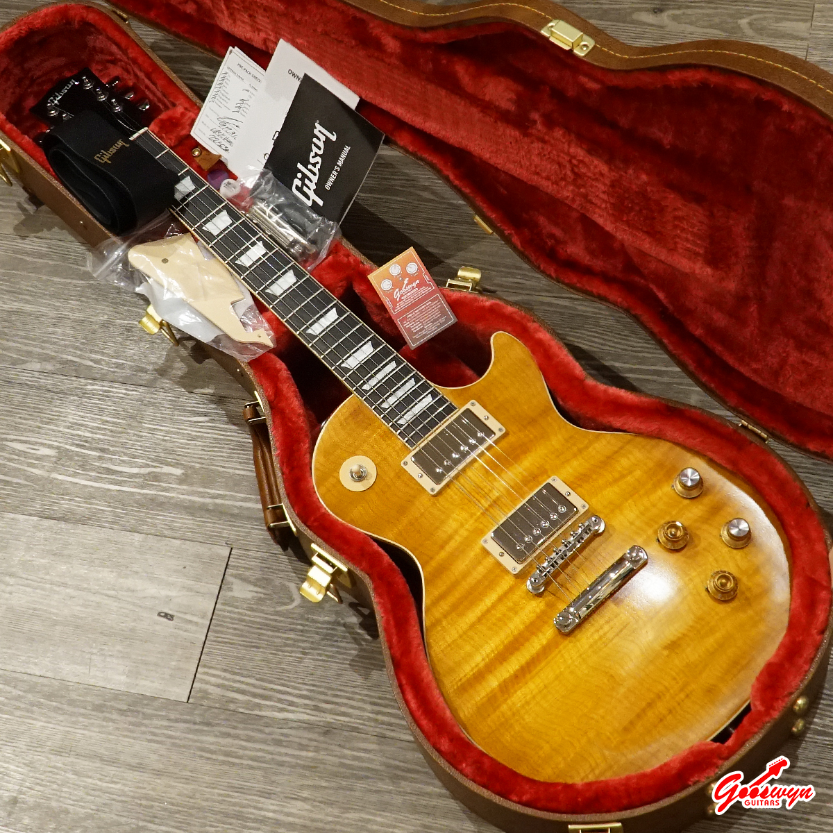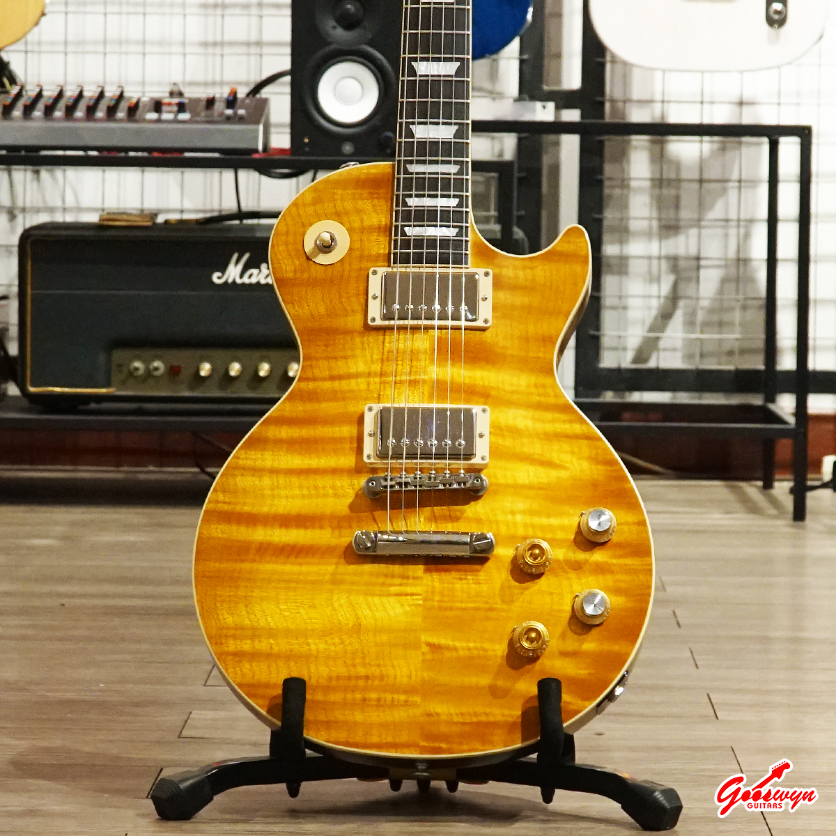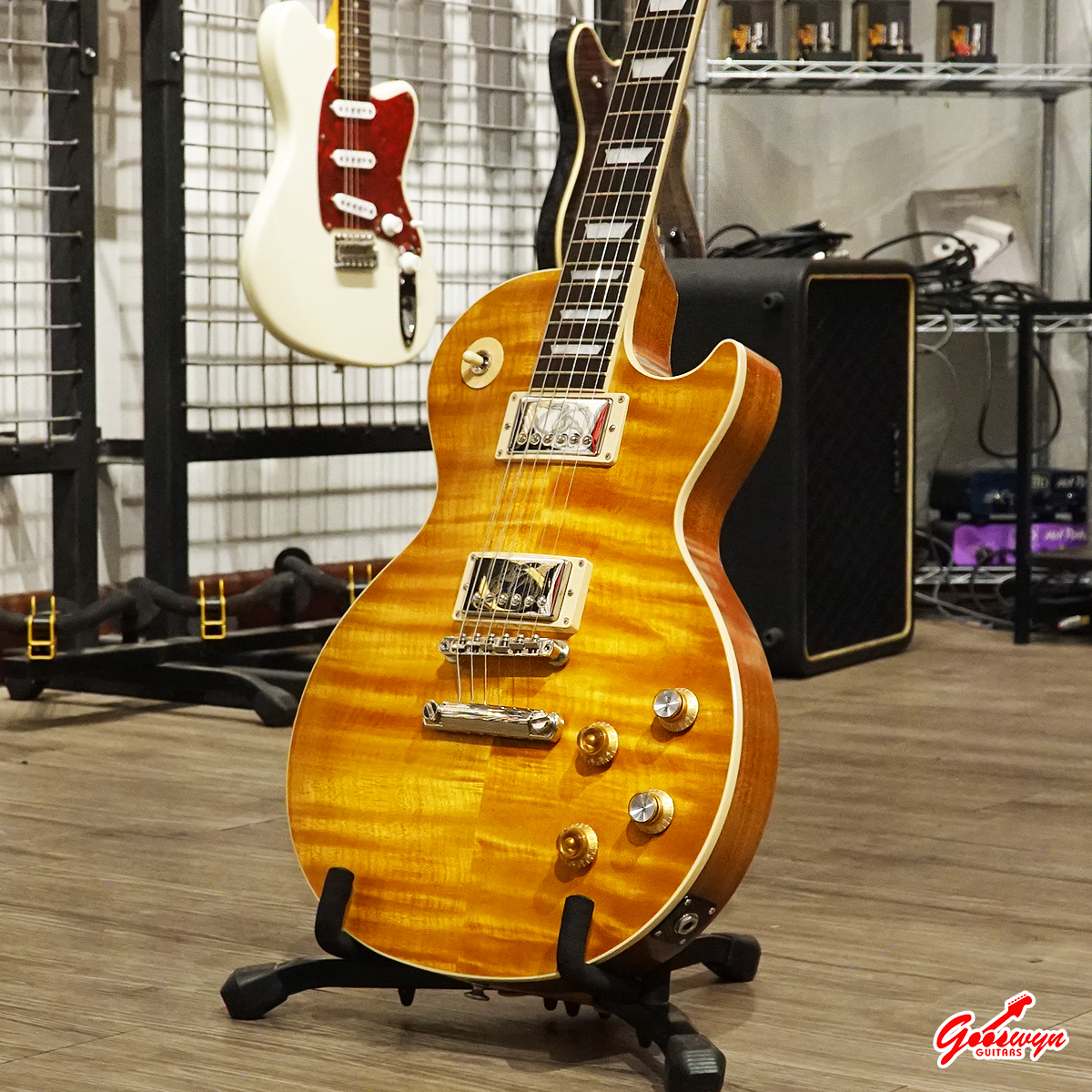 – UNCHAMBERED BODY, MAHOGANY BODY WITH AAA FLAME MAPLE TOP. MAHOGANY NECK, ROSEWOOD FINGERBOARD